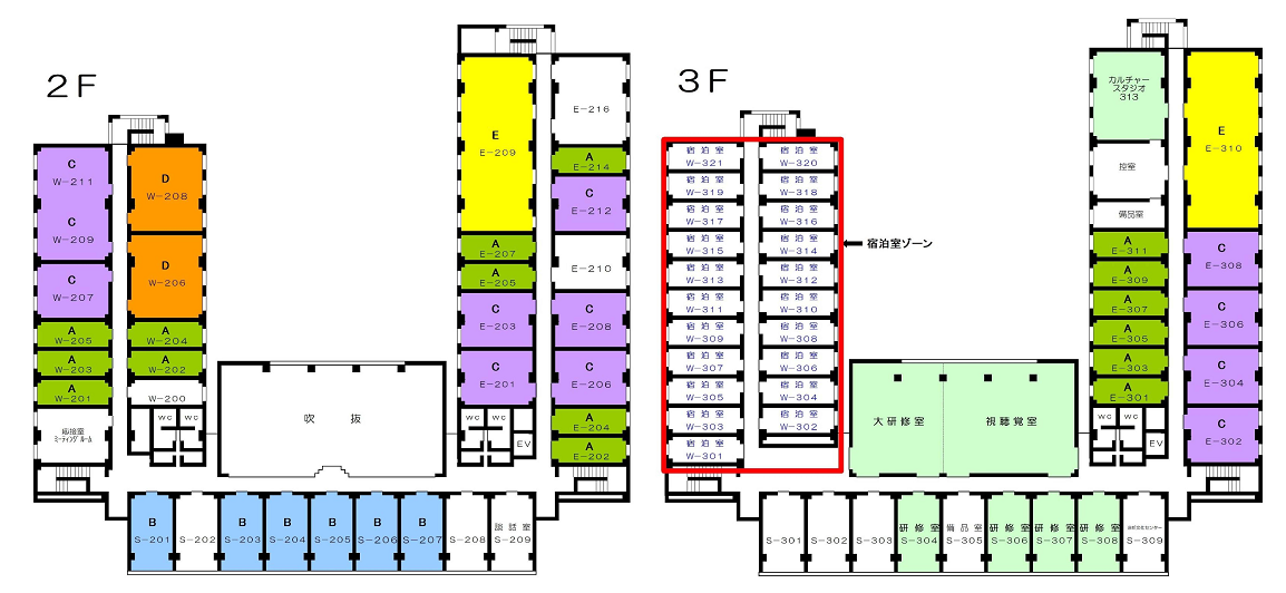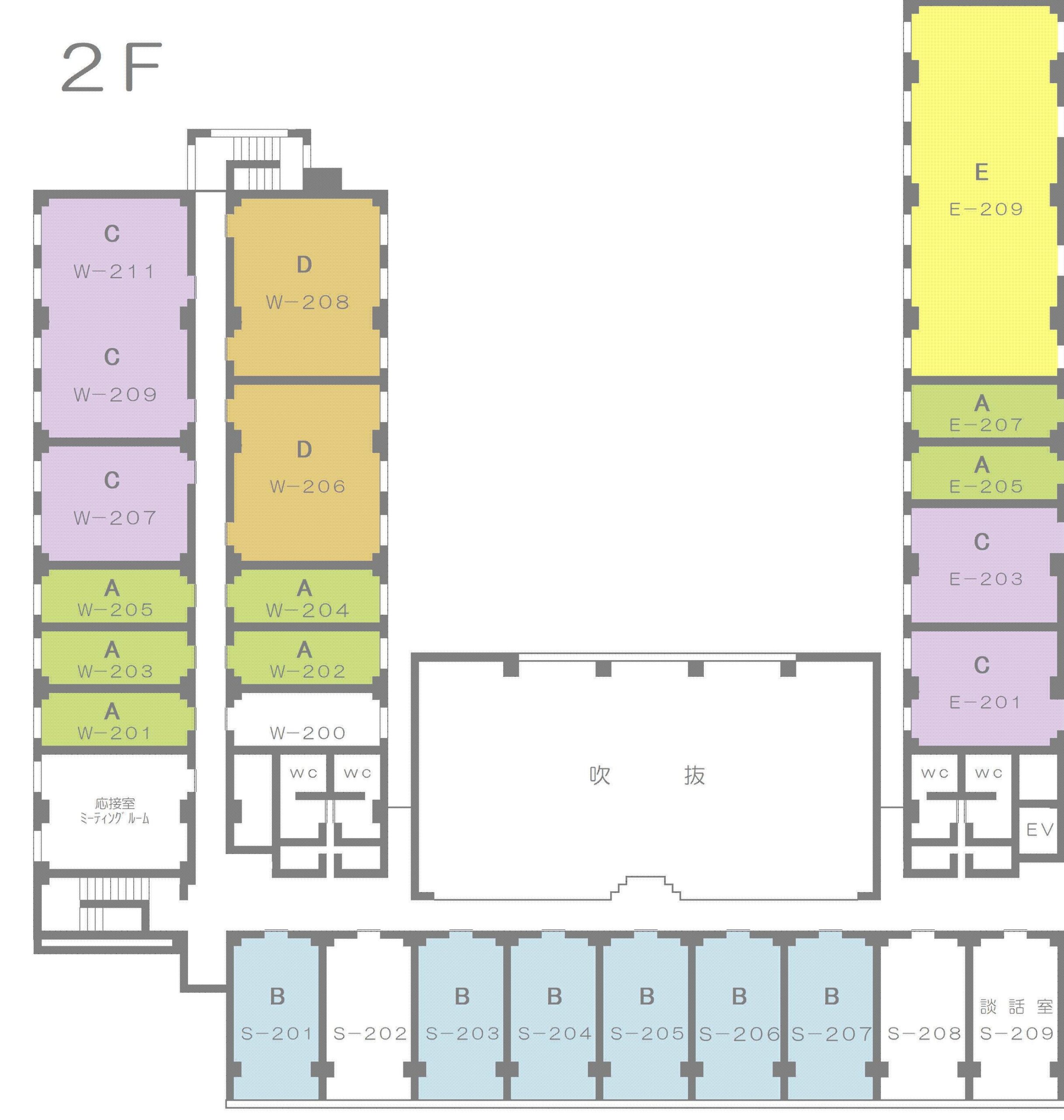 ●B、CおよびEタイプには水道・ガス・200V電源使用の機器などを設置可能な貸室があります。